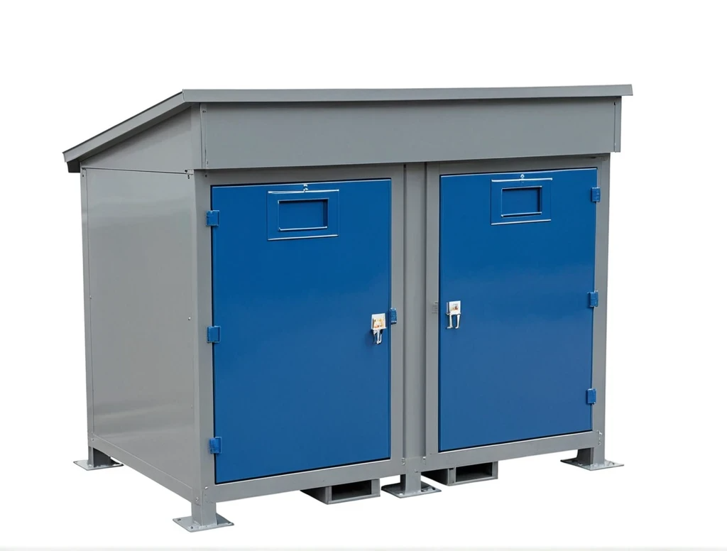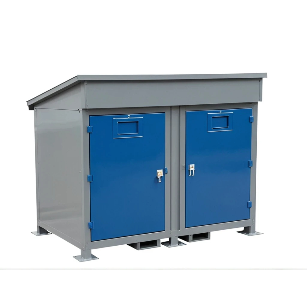 Шкаф хранилище представляет собой сварную конструкцию. Два отделения с дверцами, которые закрываются на замок. Наклонная крыша и прочное основание обеспечивают возможность его использования как внутри помещений, так и на открытом воздухе. В хранилище предусмотрена вентилируемая дверь и дно.